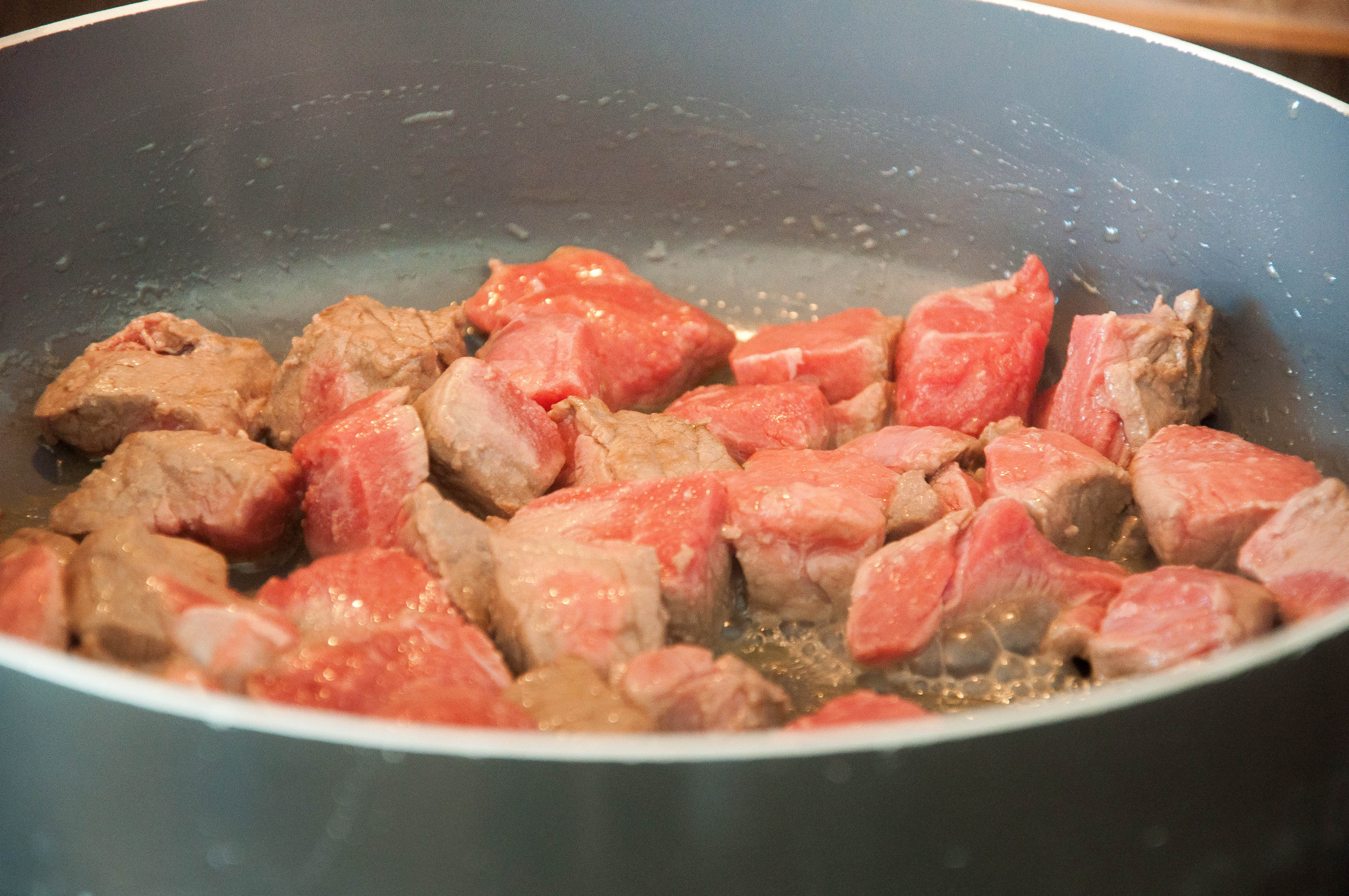 - For the beef stew: In a large casserole/oven dish, heat a tablespoon of the olive oil until shimmering. Trim any excess fat from the meat.