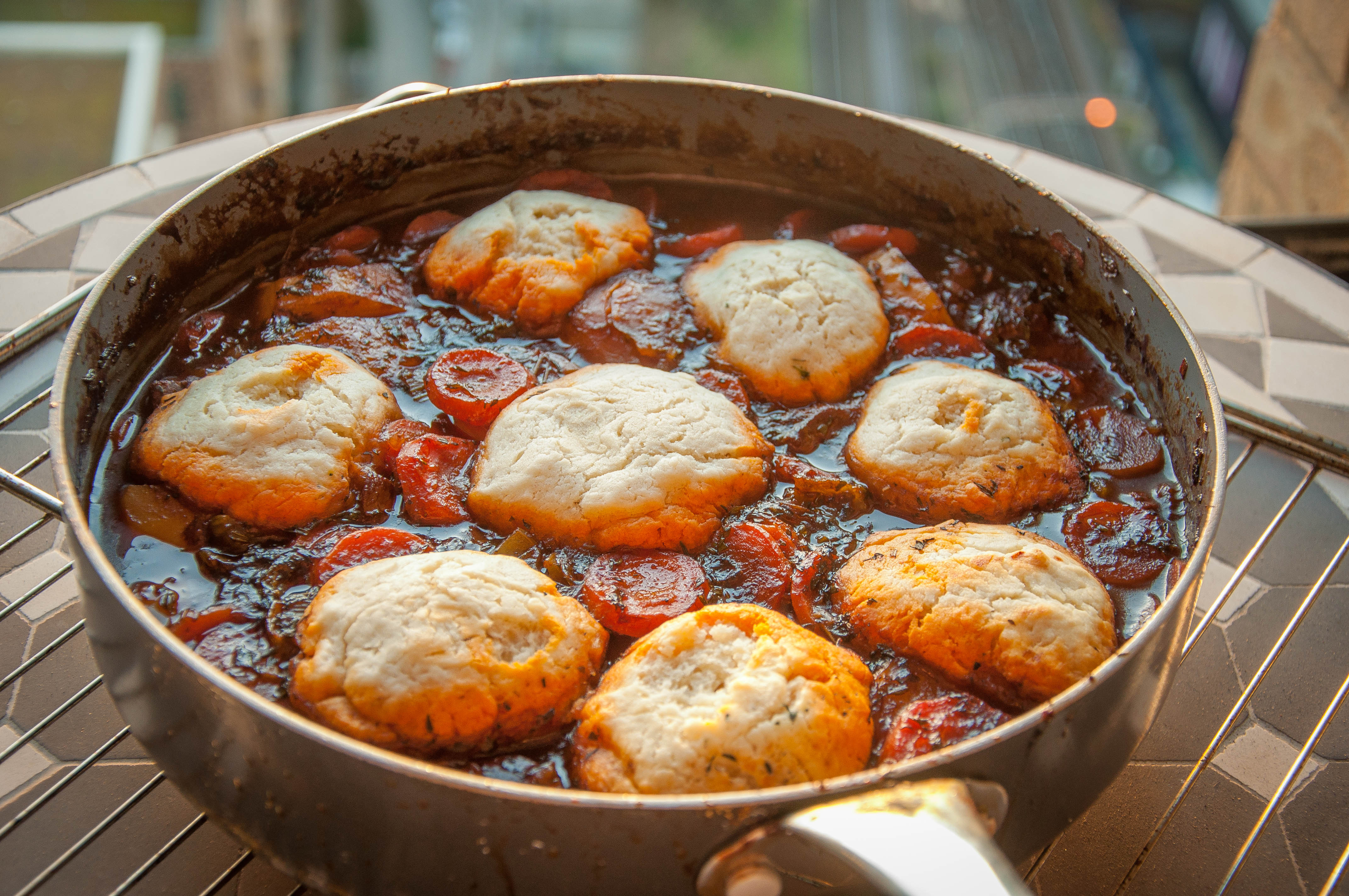- After two hours, remove the lid from the stew and place the balls on top of the stew. Cover, return to the oven and cook for a further 20 minutes, or until the dumplings have swollen and are tender.