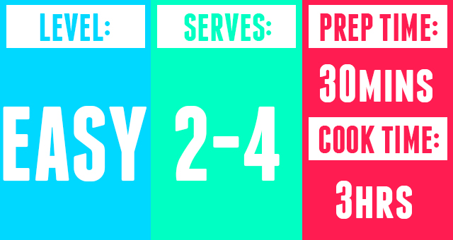 - Cover with 2 layers of foil (or a lid obviously), and transfer to the oven and cook for about two hours, or until the meat is tender.